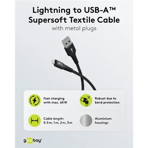 Goobay Lightning-USB-A supersoft textilkabel med metallkontakter, 3 m, svart MFi-certifierad, elegant och extra robust laddnings- och synkroniseringskabel för Apple iPhone/iPad (svart)