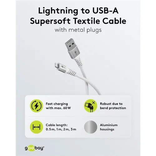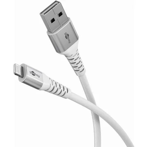 Goobay Lightning-USB-A supersoft textilkabel med metallkontakter, 3 m, vit MFi-certifierad, elegant och extra robust laddnings- och synkroniseringskabel för Apple iPhone/iPad (vit)