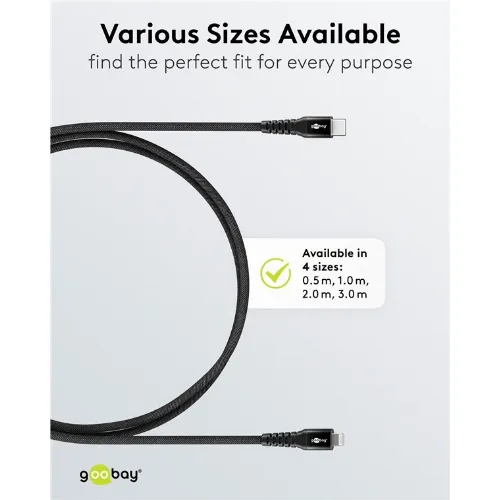 Goobay Lightning-USB-C™ supersoft textilkabel med metallkontakter, 3 m, svart MFi-certifierad, elegant och extra robust laddnings- och synkroniseringskabel för Apple iPhone/iPad (svart)