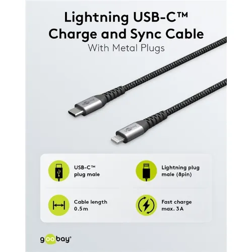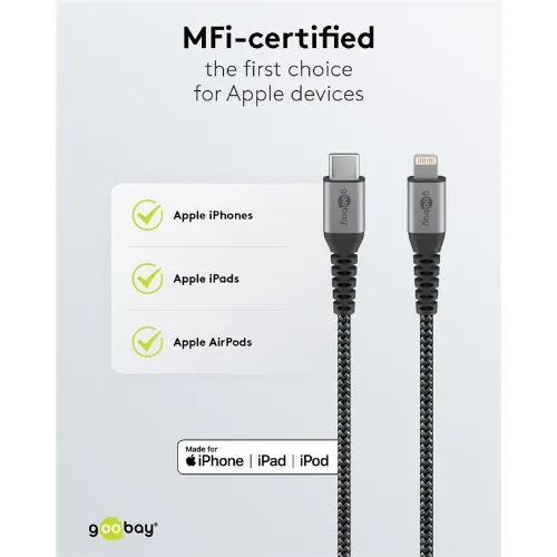 Goobay Lightning-USB-C™ textilkabel med metallkontakter, 1 m MFi-certifierad, elegant och extra robust laddnings- och synkroniseringskabel för Apple iPhone/iPad (svart, grå)