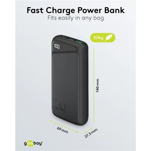 Goobay Hurtig opladning Powerbank 20.000 mAh (USB-C™ PD, QC 3.0) Kraftfuld powerbank med statusdisplay, Quick Charge-kompatibel