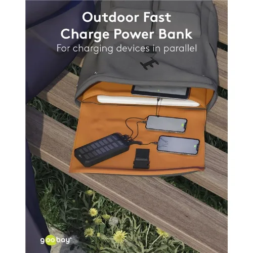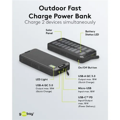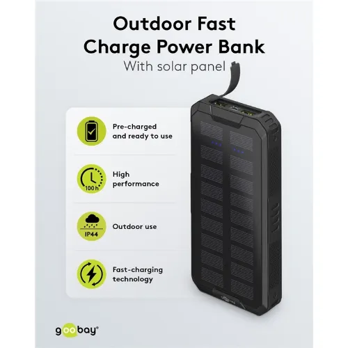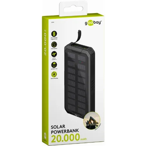 Goobay Udendørs hurtig opladning Powerbank med solcelle 20.000 mAh (USB-C™ PD, QC 3.0) Robust all-round strømforsyning til udendørs brug