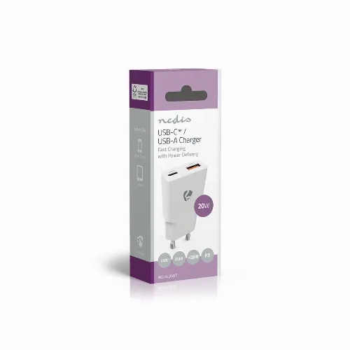 Nedis Vægoplader | 20 W | GaN | PD3.0 | 1.5 / 2.0 / 2.22 A / 3.0 A | Antal output: 2 | USB-A / USB-C™ | Automatisk Valgt Spænding | Hvid