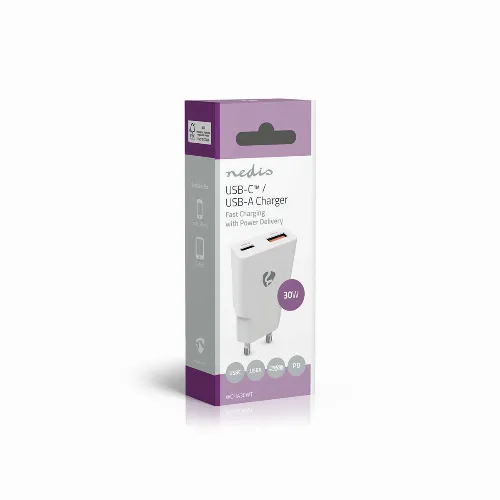 Nedis Vægoplader | 30 W | GaN | PD3.0 | 1.5 / 2.0 / 2.5 / 3.0 A | Antal output: 2 | USB-A / USB-C™ | Automatisk Valgt Spænding | Hvid