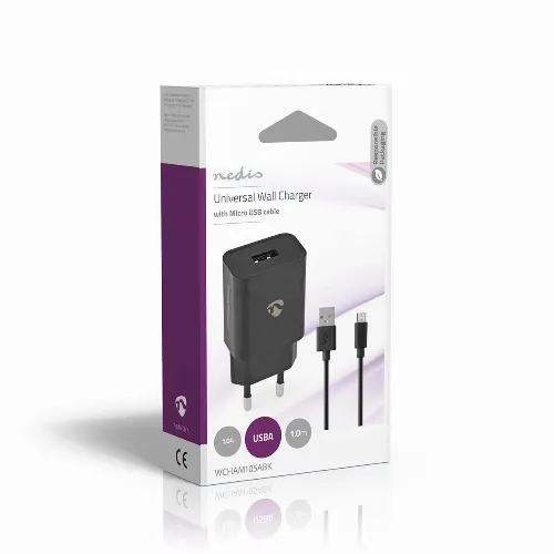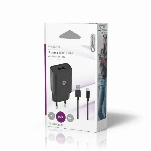 Nedis Vægoplader | 5 W | 1.0 A A | Antal output: 1 | USB-A | Micro USB (Loose) kabel | 1.00 m | Single Voltage Output | Sort
