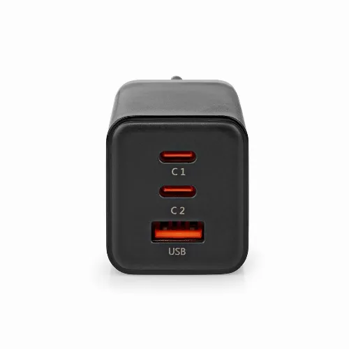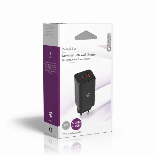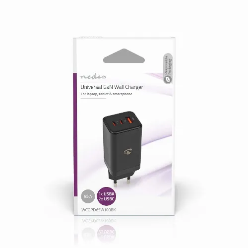 Nedis Vægoplader | 65 W | GaN | PD3.0 18W / PD3.0 20W / PD3.0 27W / PD3.0 36W / PD3.0 45W / PD3.0 60W / PD3.0 65W / QC3.0 | 3.0 / 3.25 A A | Antal output: 3 | USB-A / 2x USB-C™ | Automatisk Valgt Spænding | Sort